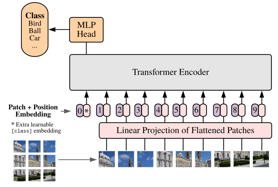 VIT의 high-level view다. Transformer에서 encoder만 가져왔고, 먼저 이미지를 patch로 나눠준다. 예로 들어 이미지가 28*28이고 patch가 4면 7*7이미지를 가져오게 된다. 이 이미지를 flatten해준 후 토큰 역활을 하는 cls_token을 concat 해준 후 각 이미지의 위치 정보를 담은 가중치 position embedding을 더해준다. 더해준 후는 encoder에 들어가게 된다