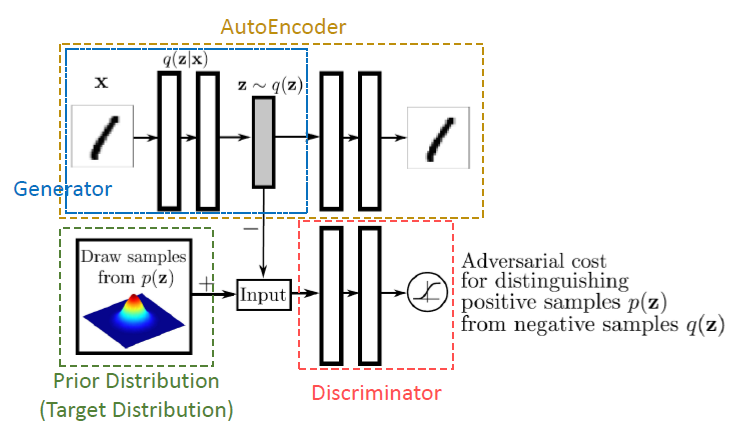 AAE는 VAE와 GAN의 개념을 합친 모델이다. VAE는 Decoder를 학습시키는 모델이지만, AAE는 Encoder, Decoder 모두 학습을 시킨다. 모델을 가장 잘 나타내는 그림은 아래와 같다