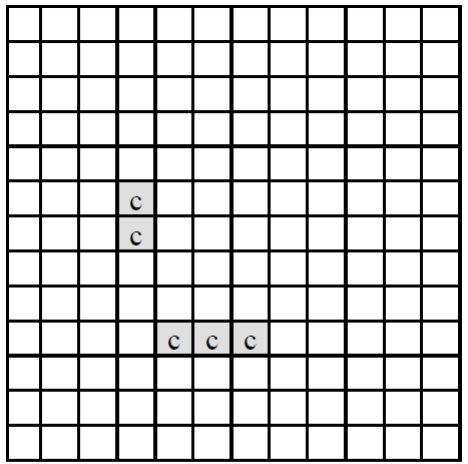 이 치즈를 공기 중에 놓으면 녹게 되는데 공기와 접촉된 칸은 한 시간이 지나면 녹아 없어진다. 치즈의 구멍 속에는 공기가 없지만 구멍을 둘러싼 치즈가 녹아서 구멍이 열리면 구멍 속으로 공기가 들어가게 된다. <그림 1>의 경우, 치즈의 구멍을 둘러싼 치즈는 녹지 않고 ‘c’로 표시된 부분만 한 시간 후에 녹아 없어져서 <그림 2>와 같이 된다.