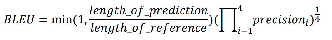 - 이를 해결하기 위해 N-gram overlap이 사용되는데, n은 1에서부터 4로 전체 corpus에 대하여 n개의 단어가 연속으로 맞는 precision을 구한다. 또한 앞에 번역된 길이가 너무 짧으면 안되므로 brevity penalty를 곱해준다.
