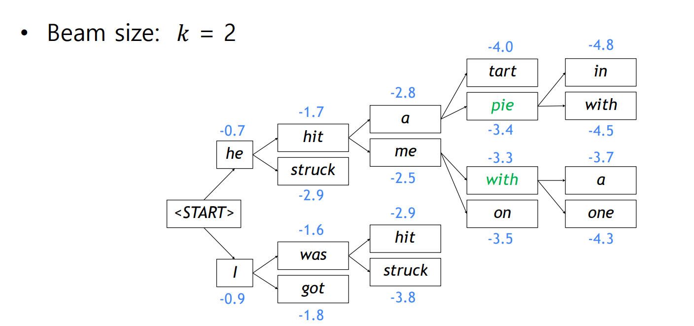 - 이 둘 사이에 있는 Beam search는 beam size k에 대하여 각 step에 제일 확률이 높은 K개의 hypothesis만 남기는 방법이다.