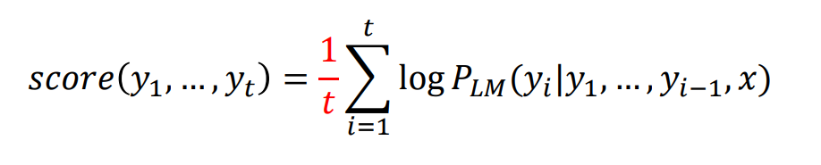 - 하나의 hypothesis의 로그 확률 값은 무조건 음수를 가진다(확률은 0~1사이이고, 이 값을 로그로 취하면 무조건 음수다). 계속 더해주면 더 작은 값을 가질 수 밖에 없다. 이 떄문에 더 길이가 긴 hypothesis는 더 낮은 확률을 가지게 된다. 이를 해결하기 위해 길이를 기준으로 normalize를 해준다.