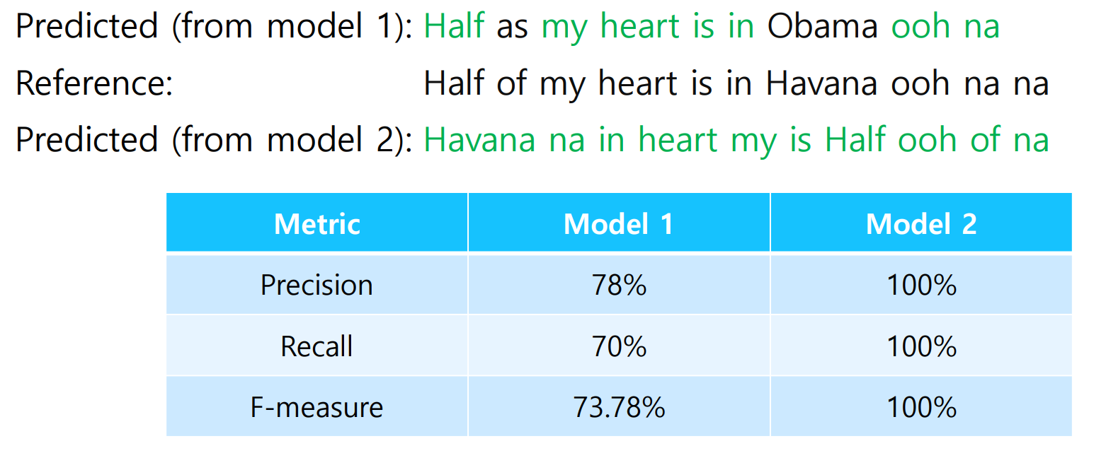 - 단순히 맞춘 개수를 따지는 precision과 recall은 machine translation에서 옳지 않은 평가 지표가 될 수 있다.