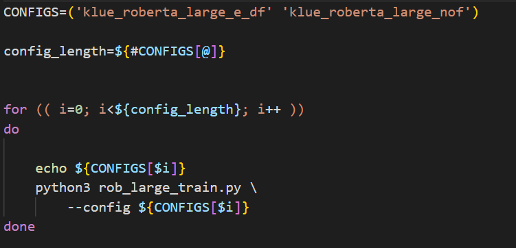 .sh 파일을 만들어서 다양한 yaml파일을 실행할 수 있다. CONFIGS에 yaml 파일 이름을 넣어주면 되는데, 여기서 Linux는 ,를 입력으로 받지 않으니 yaml 파일 이름 중간에 ,(쉼표)를 사용하지 않는 것으로 하자.