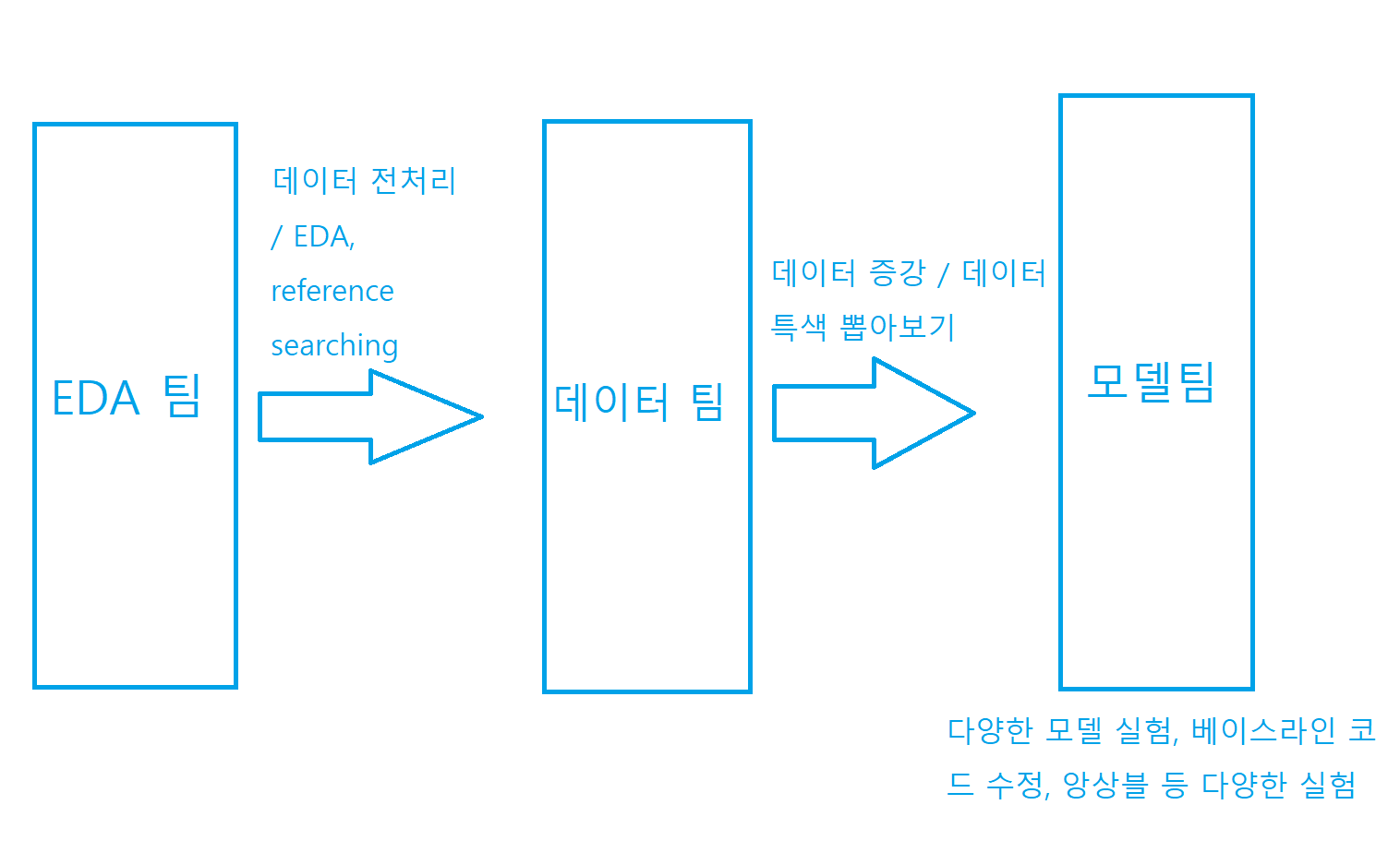 우리 팀은 총 3가지 팀으로 나뉘었는데, 모델팀, 데이터팀, EDA팀이었다. 모델, 데이터 팀에 2명씩 붙고 EDA팀을 한 명이 담당했다. 나는 개인적으로 베이스라인 코드를 이해하고, 건드려보고, 바꿔보고 새로운 시도를 해보고 싶어서 모델팀에 자원했다.