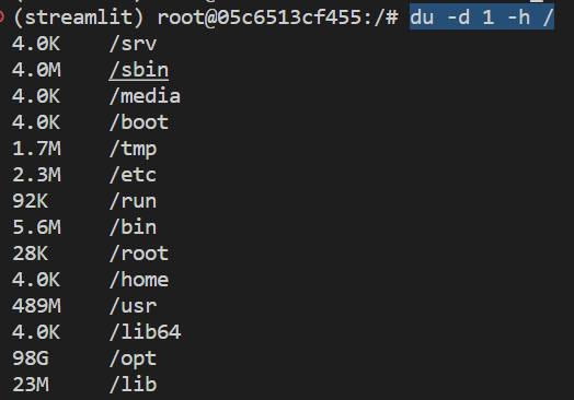 모델을 많이 돌리다보면 모델의 output과 logging 파일이 쌓여서 물리적인 스토리지가 부족할 수도 있다. OSError: [Errno 28] No space left on device 라는 에러 메세지가 이를 의미한다. 이런 경우에는 직접 스토리지에서 용량을 많이 차지하는 것이 무엇인지 확인해야 한다. 먼저 df -h로 물리적 스토리지 용량을 확인한다.