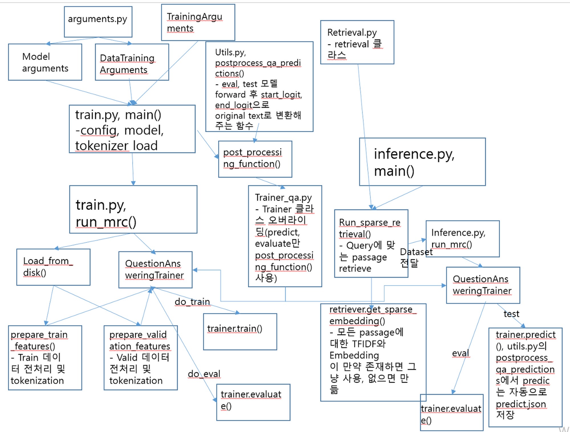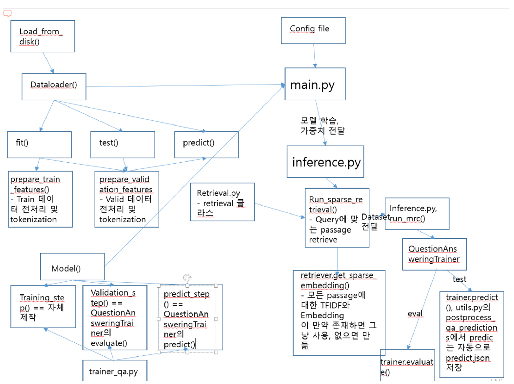베이스라인 코드를 재구현하는 가장 큰 이유는 모듈화였다. 빠른 실험을 위해서는 베이스라인 코드를 사용하는 것이 좋겠지만, 향후 다양한 실험을 하거나 새로운 기능을 추가할 시에 코드의 가독성이 떨어질 것이라 판단하였고, 이는 시간 낭비로 이어질 수 있겠다 생각이 들었다. 그래서 디렉터리를 데이터 모듈(dataset, dataloader), config(train.sh에 들어갈 config 파일), models(Custom model), retrievals, utils(데이터 전처리, 후처리 모듈, metric 모듈)로 나누어서 구현하였다.