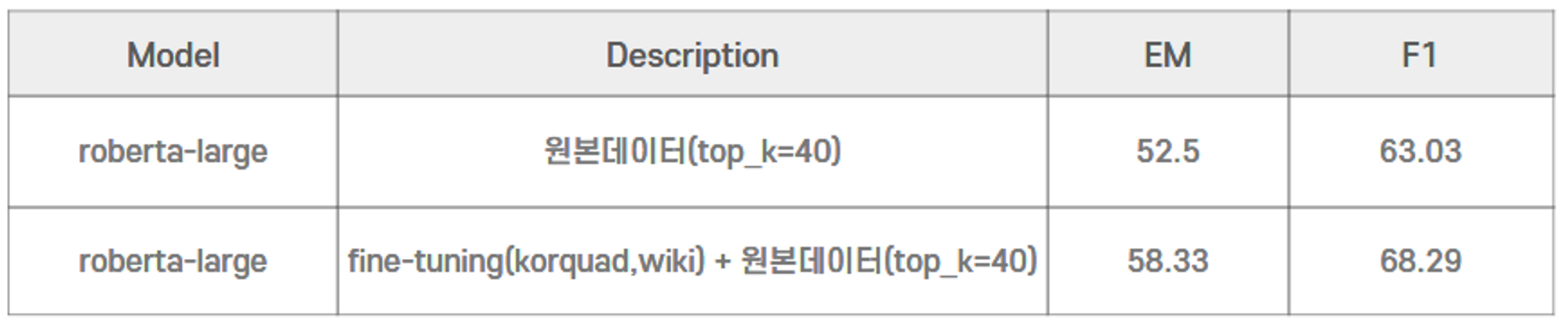 외부 데이터셋이 허용된다는 룰을 확인 한 후, Klue MRC와 유사한 korquad, wiki(AI hub) 데이터셋을 사용하기로 결정하였다. Korquad와 wiki 데이터를 합치면 대회 데이터의 30배 정도의 데어티였고, 대회 데이터와 합쳐서 학습한 결과 오히려 성능이 하락했고, 외부 데이터를 먼저 학습 했을 때 epoch를 1보다 크게 줄 경우 외부 데이터에 과적합 되어서인지 성능이 떨어졌다. 이를 통해 규모가 큰 데이터에 과적합되지 않되, TAPT로 표현력을 높이기 위해 1 에포크로 학습한 후 대회 데이터로 재학습한 결과 baseline 대비 em이 5 이상 상승하는 효과를 낼 수 있었다