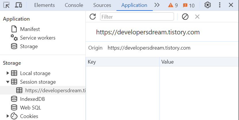 개발자 도구를 사용하여 콘솔에서 document.cookie 혹은 Application 칸에서 Cookies 목록 안을 확인하여 쿠키를 확인하고, Application 칸에서 Session Storage 안의 Sessionid를 통해 세션을 확인할 수 있다.