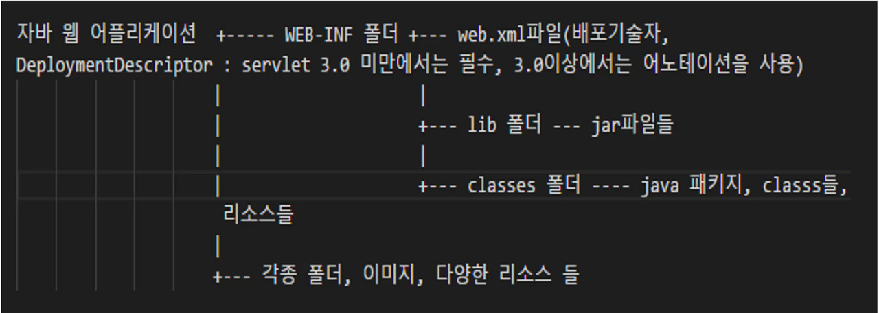 WAS등의 미들웨어에게 도움을 받을 때는 혹은 프레임워크를 사용할 때에는 정해진 약속을 지켜야 한다. 자바 웹 어플리케이션도 이러한 파일 구조를 따라야 한다. WEB-INF 폴더 안에는 web.xml파일이 존재한다. 이 웹 어플리케이션에 대한 정보를 다 가지고 있는 프로그램이다. lib(라이브러리) 안에는 자료 파일(jar)을 넣을 수 있다. classes 폴더에는 패키지, class들(서블릿 포함)이 들어간다. 같은 경로에 폴더, 이미지, 리소스들을 넣을 수 있다.