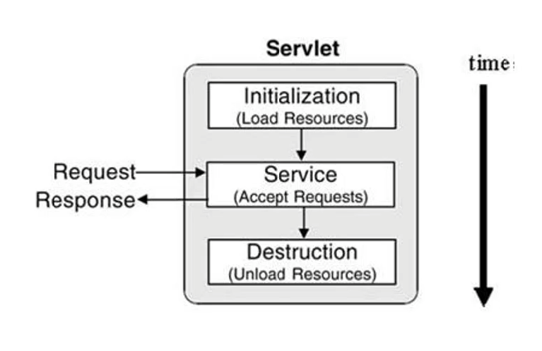 위 그림처럼 WAS는 서블릿 요청을 받으면 해당 서블릿이 메모리에 있는지 확인한다. 만약 메모리에 없으면 서블릿 클래스를 메모리에 올리고, init() 메소드를 실행한다. 그 다음 요청과 응답을 관리하는 service() 메소드가 실행된다. 만약 WAS가 종료되거나 웹 애플리케이션이 새롭게 갱신되면 destroy()메소드가 실행된다.