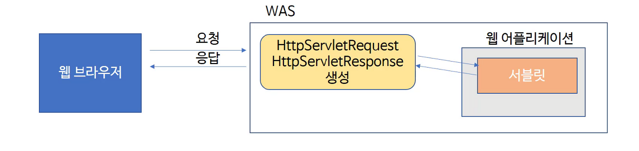 웹 브라우저에 URL을 입력하고 Enter를 치면 웹 브라우저는 도메인과 포트 번호를 이용해서 서버에 접속한다. 그 다음 path 정보, 클라이언트 ip등 다양한 정보를 포함한 요청 정보를 서버에 전송하게 된다. WAS가 웹 브라우저에게서 요청을 받게 되면 HttpServletRequest와 HttpServletresponse라는 객체를 생성하게 된다. Request 객체에는 요청할 때 가지고 들어온 다양한 정보를 이 객체에 담는다. Response 객체는 현재 접속한(클라이언트)에게 전송하기 위해 담을 수 있는 객체다. 이렇게 만든 두 개의 객체를 요청 정보에 있는 path로 mapping된 서블릿에게 전달하게 된다. 전달된 객체는 service(), doGet(), doPost()와 같은 매소드의 매개변수로 전달돼서 사용하게 된다.